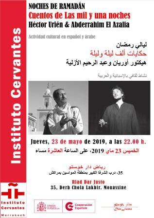ينظم معهد ثيربانتيس بمراكش بتعاون مع رياض دار خوستو 35، يوم الخميس المقبل 23 ماي 2019 على الساعة العاشرة مساء، بدرب الشرفا الكبير بمنطقة المواسين بمراكش أمسية فنية حكواتية، وذلك في إطار شهر “الصداقة الإسبانية-المغربية” وبرنامج “ليالي رمضان” الذي تنظمه شبكة معاهد ثيربانتيس بالمغرب. خلال هاته الأمسية، سيمتع الجمهور كل من الإسباني هيكتور أوريان والمغربي عبد الرحيم الأزلية بحكايات من ألف ليلة و ليلة مسرودة باللغتين الإسبانية والمغربية.