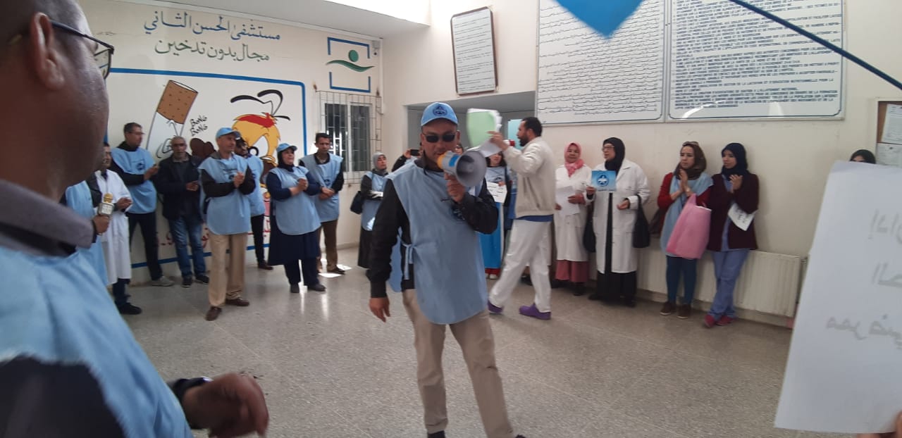 نظم أعضاء ومنخرطات ومنخرطو المكتب الإقليمي للجامعة الوطنية للصحة (إ م ش) لإقليم خريبكة،وقفة احتجاجية أمام المديرية الجهوية لوزارة الصحة لجهة بني ملال- خنيفرة، وذلكــ بعد مضي شهر على تنفيذ الوقفة الاحتجاجية الناجحة الأولى بالمستشفى الإقليمي الحسن الثاني بخريبكة ضد “قرصنة” الإدارة الصحية وتحويلها في عهد المسيرين الحاليين لأداة للانتقام والتمييز بين الموظفين.