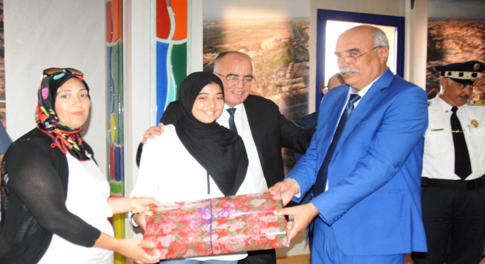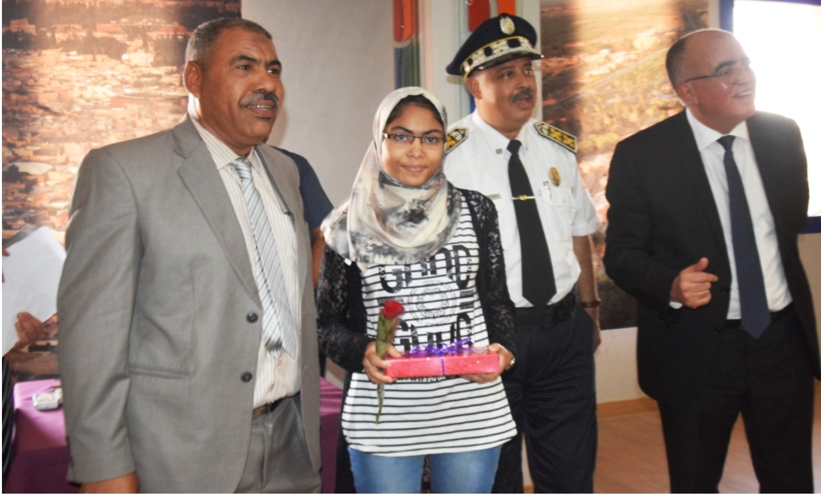 هــذا، وخلال حفل أقيم على شرف التلاميذ المتفوقين،وباقي الحضور من أبائهم وأمهاتهم وأوليائهم، ثمن والي أمن ولاية مراكش العلوة المبادرة الإنسانية والتربوية الحضارية الصادرة من المدير العام للأمن الوطني ومن مؤسسة محمد السادس للأعمال الاجتماعية لموظفي الأمن الوطني التي سهرت على تنزيلها، تكريما للتلاميذ المتفوقين وتشجيعا لأمثالهم من أبناء وأيتام موظفي الشرطة وحثهم على الجد التربوي والتحصيل الدراسي والحرص على التميز، كما شكر أمهات وآباء التلاميذ على تضحياتهم الجسام وحسن تربيتهم وعلى ما وفروه من أسباب النجاح لفلذات أكبادهم.