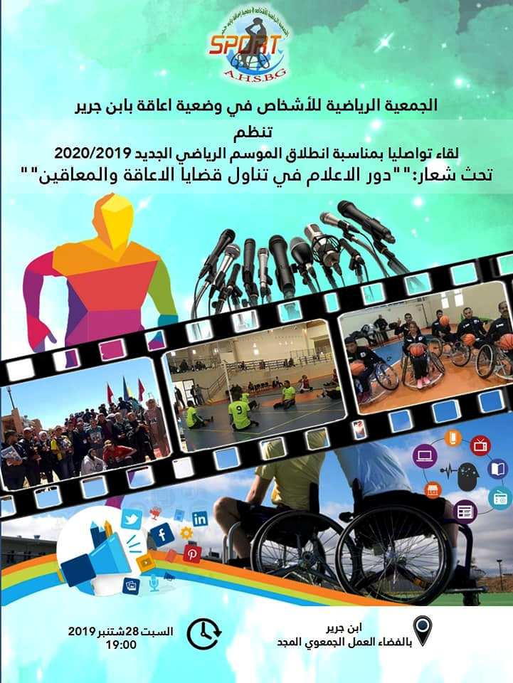 بمناسبة بداية الموسم الرياضي الجديد 2019/2020 ، وتحث شعار:”دور الاعلام في تناول قضايا الاعاقة والمعاقين” تنظم الجمعية الرياضية للاشخاص في وضعية اعاقة بابن جرير،بشراكة مع الجماعة الترابية لــ بن جرير بإقلم الرحامنة، والمجلس الاقليمي ومديرية الشباب والرياضة، لقاء تواصليا،يوم السبت 28 شتنبر الحالي بالفضاء العمل الجمعوي المجد إبتداءا من الساعة السادسة مساء.