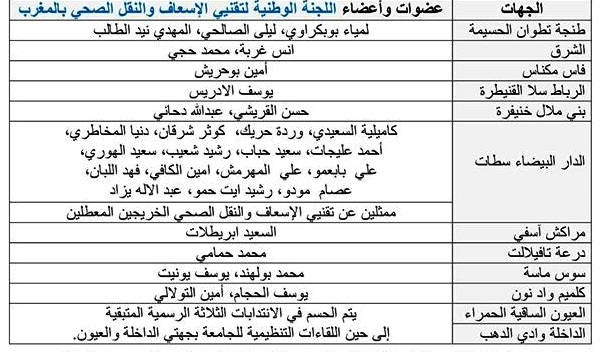 وبعد مناقشة ظروف العمل الصعبة والإكراهات التي تواجه تقنيات وتقنيو الإسعاف والنقل الصحي، والتداول في الملف المطلبي، تم تشكيل اللجنة الوطنية لتقنيي الإسعاف والنقل الصحي بالمغرب من ممثلي المناطق والجهات ومواقع العمل، من بينها معاهد التكوين وحظيرة السيارات.. والخريجين، يكون من مهام أعضاء اللجنة الوطنية “الخمسة والثلاثون” بالجهات -بالإضافة لمها هو وطني- التنسيق النضالي والتنظيمي وتشكيل اللجن الجهوية بالتعاون مع المكاتب الجهوية للجامعة الوطنية للصحة (إ م ش)، والتي جاءت كالتالي :
