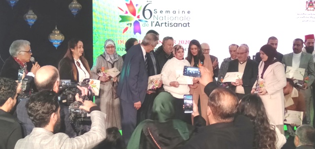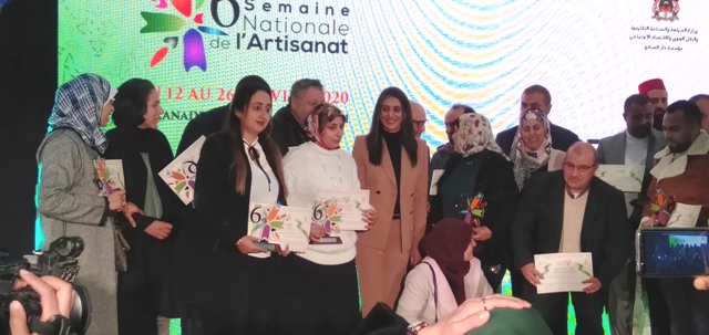 في إطار الدورة السادسة للأسبوع الوطني للصناعة التقليدية، المنظمة بساحة باب جديد في مراكش تحت الرعاية السامية لصاحب الجلالة الملك محمد السادس من 12 إلى 26 يناير الجاري ، ترأست نادية فتاح العلوي، وزيرة السياحة والصناعة التقليدية والنقل الجوي والاقتصاد الاجتماعي، بحضور عبد الله عدناني، المدير العام لمؤسسة دار الصانع،ومجموعة من المدراء الجهويين لقطاع الصناعة التقليدية حفلا لتسليم الجوائز والشهادات التقديرية لعدد من الحرفيات والحرفيين المهرة، المنحدرين من مختلف جهات المملكة، تقديرا لإنتاجاتهم الإبداعية في مختلف الأنواع الحرفية الفنية، وتثمينا لما يقومون به من حفاظ على صنائعهم وللجهود التعلمية التي يقدمونها للناشئة من الصناع التقليديين.