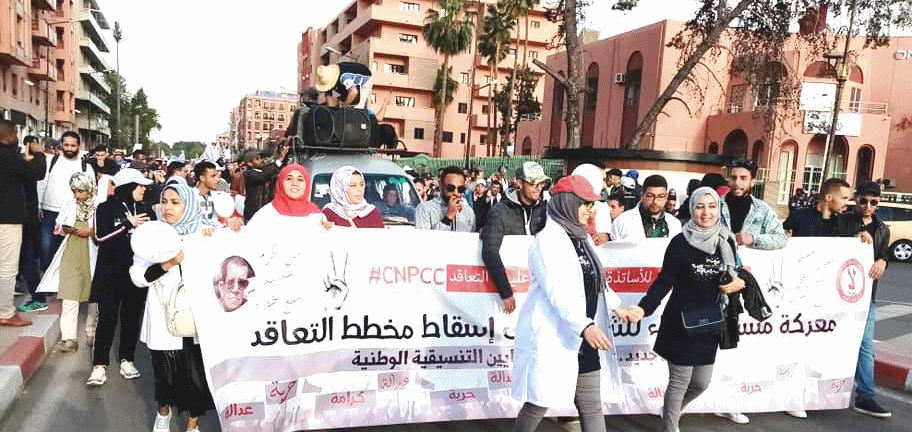 الآلاف من الأساتذة المتعاقدين يُطْبِقون أفاق بعض شوارع مراكش الرئيسية للمطالبة بحقوقهم