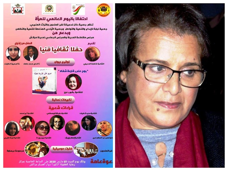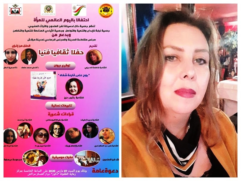 إحتفالا بالثامن من مارس اليوم العالمي للمرأة ، تنظم كل من جمعية دلال لحسيكة لفن الملحون، والتراث المغربي، وجمعية لبابة للإبداع والتنمية والتواصل، وجمعية الأيادي المخلصة للتنمية والتضامن،لرئيستها سميرة طايف ، وبدعم من مجلس مقاطعة المدينة مراكش، والمجلس الجماعي بذات المدينة،حفلا فنيا ثقافيا، يوم السبت المقبل 7 مارس الجاري، بمركز رعاية الطفولة “ذكور” في دوار العسكر بمراكش، تقدمه الزجالة الشاعرة فاطمة المعيزي، ويخرجه كل من المبدعين محمد ماماد، وسمية الطايف، تحت نغمات وموسيقى جوق فن الملحون وترانيم مجموعة عيساوة حيث من المنتظر أن تعرف فعاليات الحفل، توقيع ديوان “بوح على قارعة شفاه” للشاعرة بشرى عزيز، المميزة على مستوى التعامل مع التفعيلة شكلا ومضمونا، دلالات وإيحاءات، وزنا وإرتماءات في لجة البوح وعنفوانية القصيدة المغربية الحداثية المعاصرة . كما ستعرف فعاليات الحفل، قراءات شعرية لعدد من الأسماء النسائية الشعرية ، على غرار الشاعرة حفيظة اليوسفاني، كشاعرة تنظم العبارات الطرية والممشوقة كما تتنفس الهواء، والشاعرة منى عبد السلام لعرج، والشاعرة سعيدة عفيف، والشاعرة إلهام زويريق، مبدعة “على الرغم من أنف أبي” ، في إشارة بلاغية حالمة لوالدها الشاعر الكبير إسماعيل زويريق، والشاعرة أمينة فقيري، والشاعرة ثريا أولاد عبد الله، الموقعة لأعمالها الإبداعية بإسم البيضاء، ثريا محمد.