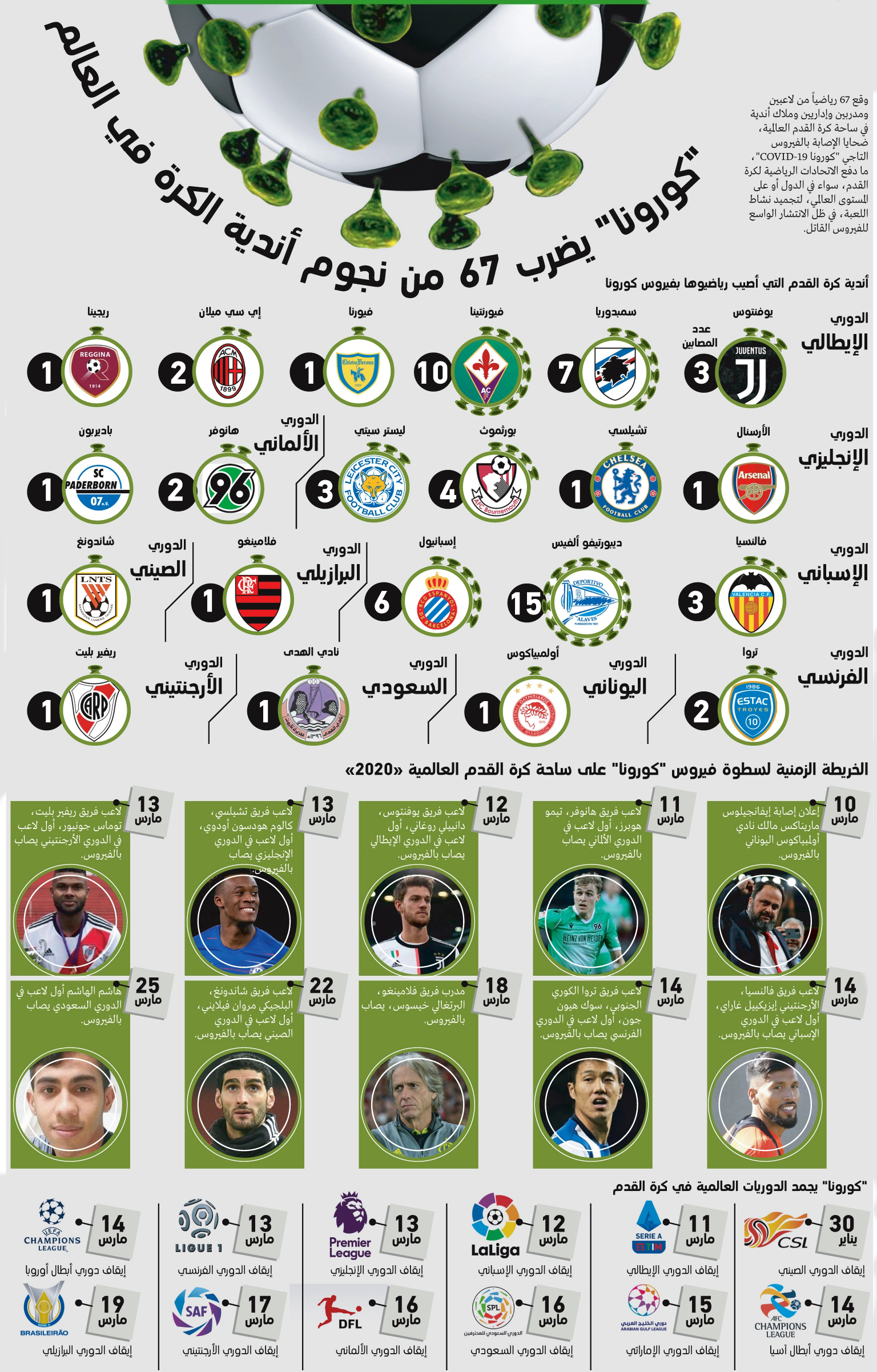 وقع 67 رياضياً من لاعبين ومدربين وإداريين وملاك أندية في ساحة كرة القدم العالمية، ضحايا الإصابة بالفيروس التاجي “كورونا COVID-19″، ما دفع الاتحادات الرياضية لكرة القدم، سواء في الدول أو على المستوى العالمي، لتجميد نشاط اللعبة، في ظل الانتشار الواسع للفيروس القاتل.