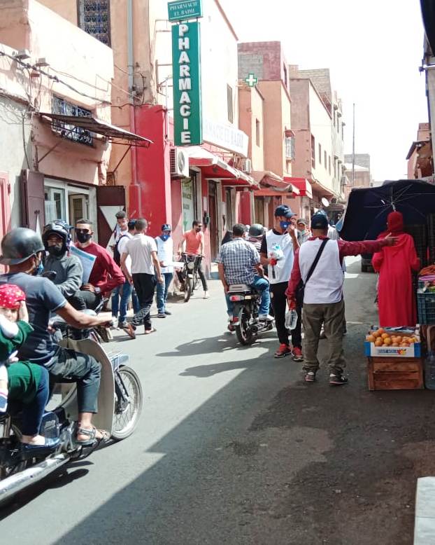 هذا،وغطت الحملة التحسيسية وعملية توزيع الكمامات على الساكنة و الشباب و اليافعين، والتي أطرتها فعاليات المكتب الجهوي للجامعة الوطنية للتخييم و اطر المديرية الجهوية للشباب و الرياضة، يومين متتالين بمختلف الأحياء المستهدفة بكل أحياء المدينة الحمراء .