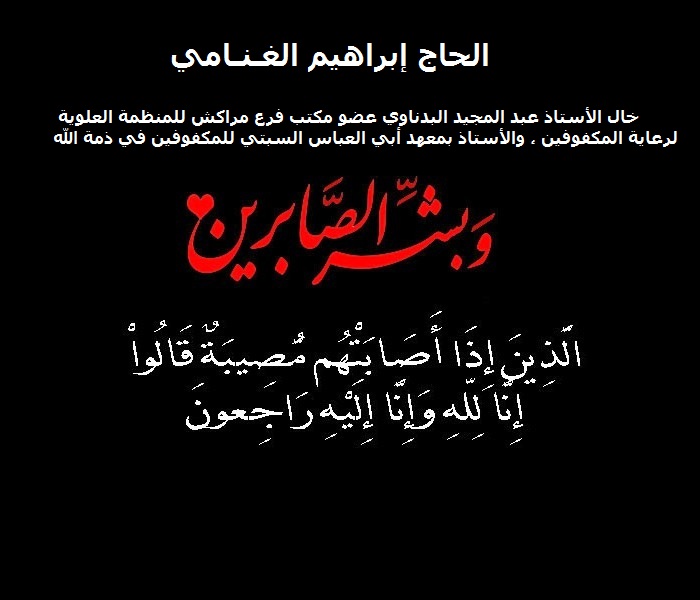وإذ تنعي الدكتور لطيفة بلالي رئيسة مكتب فرع مراكش للمنظمة العلوية لرعاية المكفوفين، أصالة عن نفسها ونيابة عن كل أعضاء المكتب،ومستخدمي المعهد والأستاذ عبد الرحيم المهدب مدير معهد أبي العباس السبتي للمكفوفين بمراكش أصالة عن نفسه ونيابة عن كل أساتذة المعهد وأطر الإدارة، ومصطفى الريحاني رئيس وأعضاء مكتب جمعية أمهات وأباء وأولياء تلاميذ المعهد المذكور، متقدمين للأستاذ عبد المجيد البدناوي عضو مكتب فرع المنظمة، والأستاذ بالمعهد بأحر التعازي وأبلغ المواساة على إثر وفاة خاله المشمول بعفو الله ومغفرته،ولكل عائلة الفقيد ومن هم من أرحامه، راجين من الله تعالى أن يبدل الفقيد داراً خيراً من داره، وأهلاً خيراً من أهله، ويدخله فسيح جنانه، وينزله الله عز وجل منزلاً مُباركاً محمودا، وهو خير المنزلين مع النبيئين والصدّيقين، والشّهداء، والصّالحين، وحسُن أولئك رفيقاً.