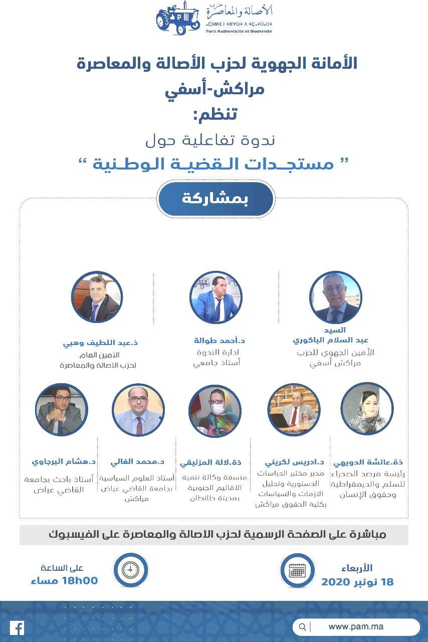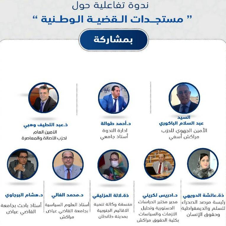 أجمع المشاركون والمشاركات في ندوة نظمتها عن بعد الكتابة الجهوية لحزب الآصالة والمعاصرة بجهة مراكش آسفي ، وإفتتح فعاليتها عبد اللطيف وهبي الأمين العام للحزب،بمشاركة عبد السلام الباكوري أمين ذات الحزب بالجهة المذكورة ، ومجموعة من الفعاليات الحقوقية والأساتذة الجامعيين وأطر الحزب،أن تحركات “البوليساريو” إعتبرت من طرف المنتظم الدولي “انتهاك صارخ” لقرارات مجلس الأمن.