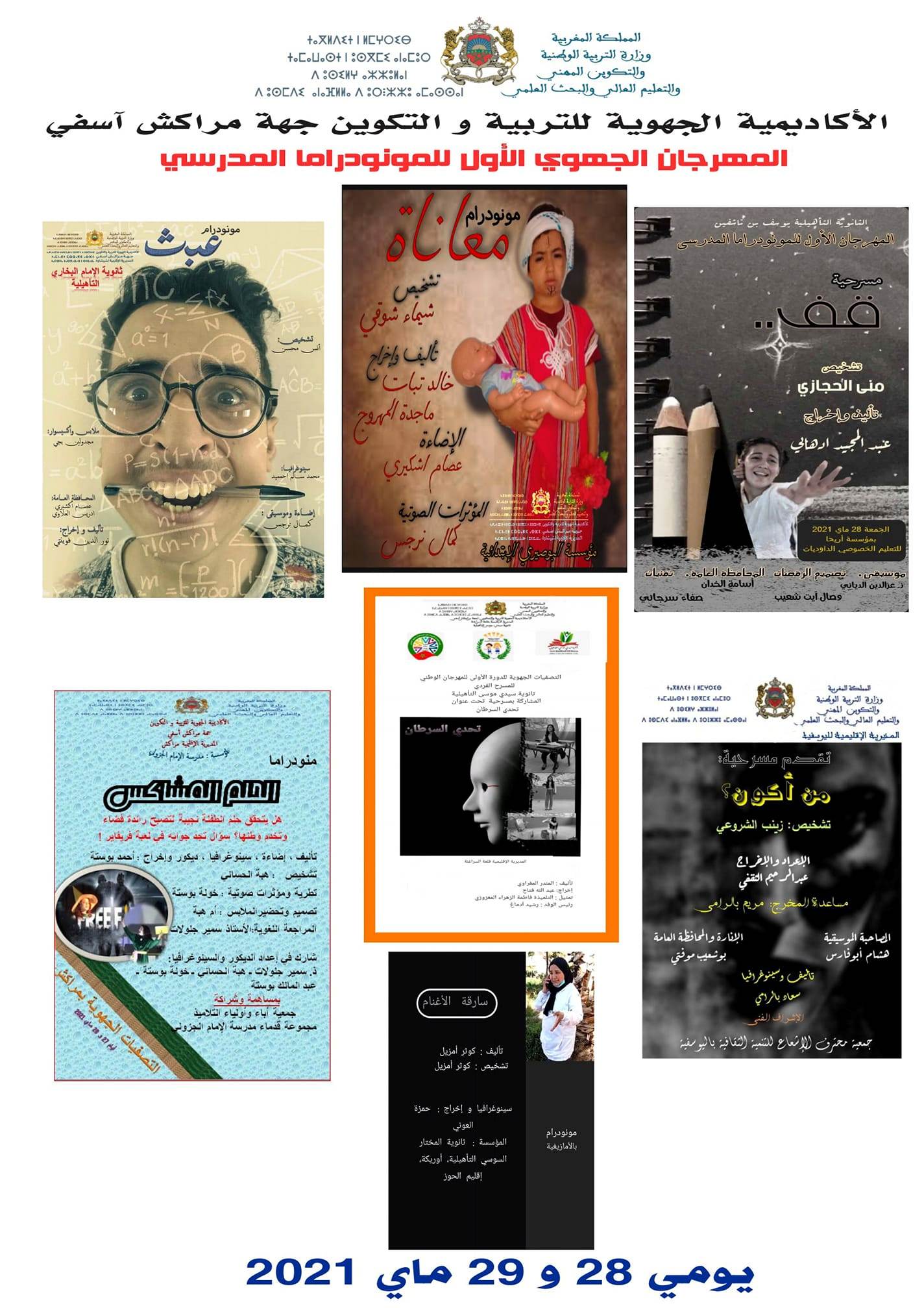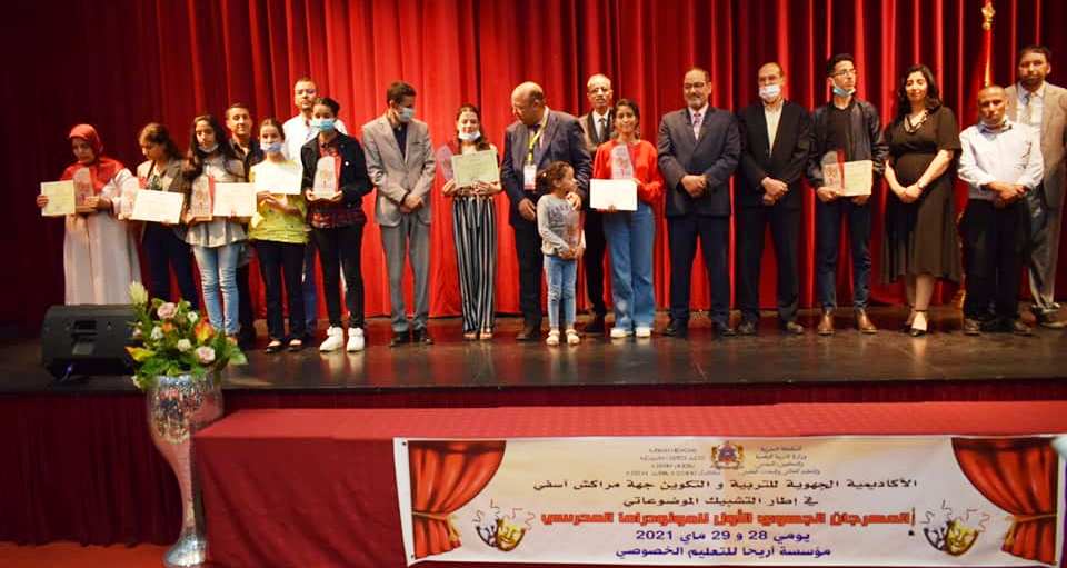 هذا، وتم تتويج السلك الابتدائي من مديرية إقليم أسفي من خلال مسرحية “القوة الحقيقية” بجائزة التأليف المسرحي، و السلك التأهيلي بمسرحية “من أكون؟” من مديرية اليوسفية. في حين، توج سلك الابتدائي من مديرية الصويرة بجائزة الامل من خلال مسرحية “التربية الدامجة” ، والسلكــ التأهيلي بمسرحية “جاري لي جيد عاري” من نفس المديرية ، كما حصلت جائزة التشخيص ، من السلك الابتدائي التلميذة شيماء شوقي من مديرية إقليم شيشاوة بمسرحية معاناة امرأة، التلميذة فاطمة الزهراء المعزوزي من السلك الاعدادي بمسرحية “تحدي السرطان” من مديرية إقليم قلعة السراغنة .