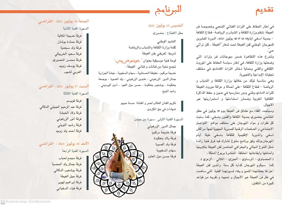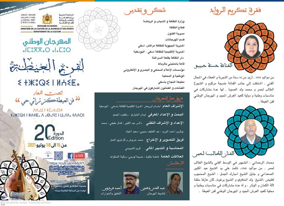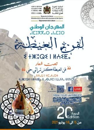 تستمر فعاليات الدورة العشرين للمهرجان الوطني لفن العيطة، التي إنطلقت أمس 15 يوليوز الحالي إلى غاية الـ 18 من نفس الشهربمدينة آسفي، وهي الدورة التي تنظمها قطاع الثقافة بوزارة الثقافة والشباب و الرياضة تحت شعار ” العيطة ، كنز تراثي حي ” وذلكــ ، في إطار الحفاظ على التراث الغنائي الشعبي وخصوصا فن العيطة، وعموم الموروث الثقافي والفني وحماية ذخائر التراث اللامادي في مختلف تجلياته الإبداعية والتعبيرية.