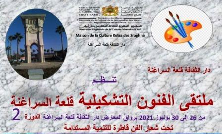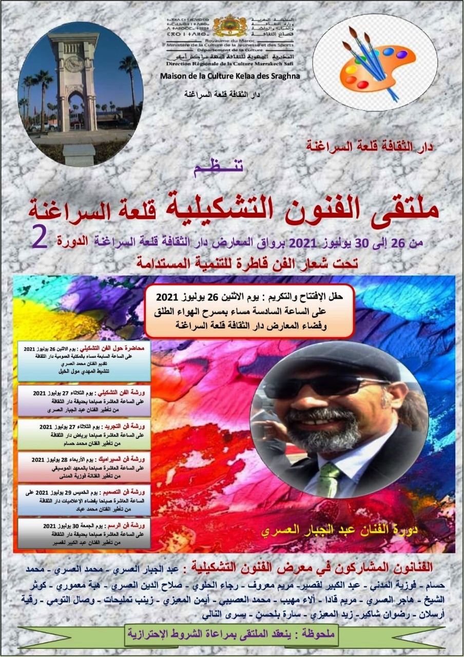 تحت شعار “الفن قاطرة للتنمية المستدامة”،وفي احترام تام للشروط الاحترازية الجاري بها العمل للوقاية من انتشار فيروس كورونا،تنظم دار الثقافة قلعة السراغنة الدورة الثانية لملتقى الفنون التشكيلية،خلال الفترة الممتدة ما بين 26 و30 يوليوز الجاري برواق المعارض دار الثقافة بقلعة السراغنة.