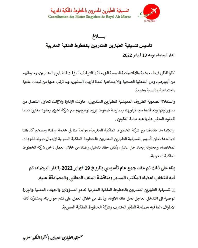 وللإشارة، فإن التسيقية المذكورة، كانت قد تأسست منذ السبت 19فبراير2022 بالدار البيضاء، كما كانت قد شددت على الوزارة الوصية والمسؤولين والجهات المعنية بضرورة ” التدخل العاجل لحل هذه الأزمة وذلك من خلال فتح حوار بناء بمشاركة كافة الأطراف، لما فيه مصلحة الطيار المتدرب وشركة الخطوط الملكية المغربية”.