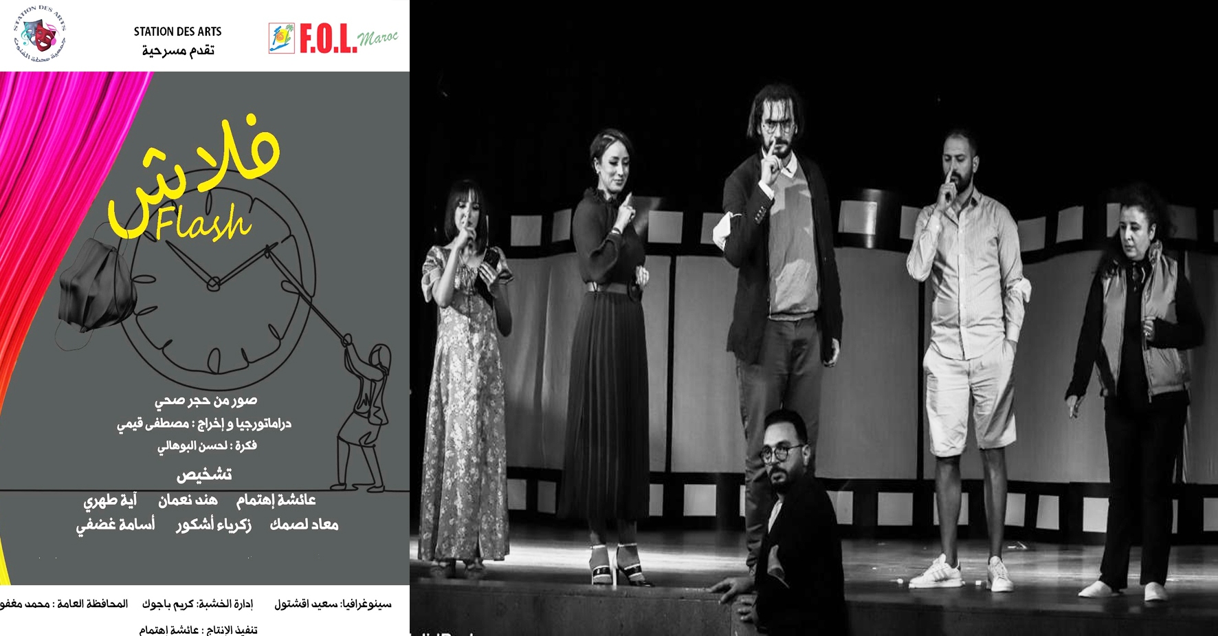 قدمت فرقة محطة الفنون بقاعة العروض La fol في الدار البيضاء عرضها المسرحي الأول بعنوان ” فلاش ” دراماتورجيا و اخراج الفنان مصطفى قيمي عن فكرة لحسن البوهالي، وهي من تشخيص ثلة من الفنانين المبدعين: عائشة اهتمام ، زكرياء اشكور، محمود أسامة غضفي، هند نعمان، معاد لصمك، أية طهري، و التقنيات و المحافظة العامة للفنان محمد مغفول، و إدارة الخشبة لعبد الكريم باجوك،في حين، كانت السينوغرافيا للفنان سعيد اقشتول، وتنفيذ الإنتاج للفنانة عائشة اهتمام.