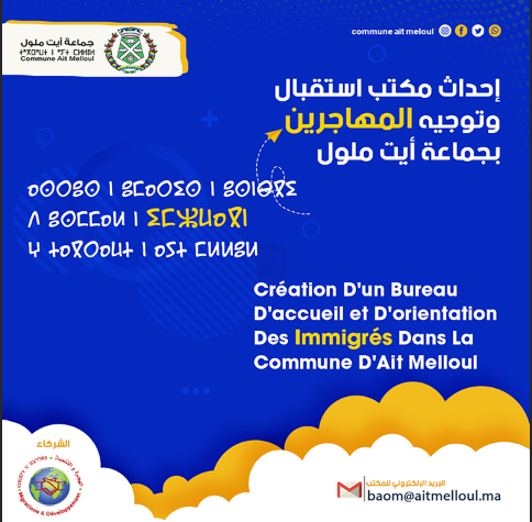 تطبيقاً لمقتضيات دستور المملكة المغربية والذي نص على أن الدولة والمؤسسات العمومية والجماعات الترابية تعمل على تعبئة كل الوسائل المتاحة لتيسير أسباب استفادة المواطنين والمواطنات من مختلف الخدمات العمومية وعلى استمرارية مرافقها، وتماشيا مع العناية الموصولة التي يوليها جلالة الملك محمد السادس نصره الله لمواطني المهجر، من خلال نهج سياسة جديدة لتدبير شؤون وقضايا هذه الفئة من الشعب المغربي، وانطلاقا مما أقره دستور المملكة لسنة 2011 من حقوق و واجبات وما جسده من مكتسبات لفائدة المواطنين والمواطنات المغاربة المقيمين بالخارج، وارتباطا مع البرنامج الحكومي الهادف إلى صيانة كرامة وحقوق مغاربة العالم، وبناءً على اتفاقية شراكة بين جماعة أيت ملول وجمعية الهجرة والتنمية، ينهي رئيس المجلس الجماعي لأيت ملول إلى علم كافة المواطنين والمواطنات عن إحداث مكتب يعني باستقبال وتوجيه المهاجرين على صعيد جماعة أيت ملول، سواءً تعلق الأمر بالمغاربة المقيمين بالخارج القاطنين بالجماعة وذوي حقوقهم وكذا المهاجرين المتواجدين بتراب الجماعة من مختلف دول العالم.