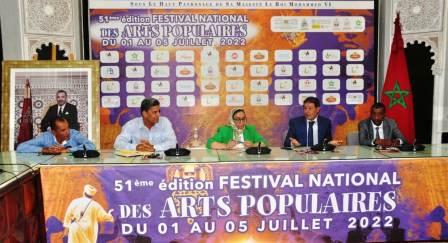 خلال حديثة في الندوة الصحافية التي إنعقدت بقصر بلدية مراكش، في أفق تنظيم الدورة الــ 51 للمهرجان الوطني للفنون الشعبية تحت الرعاية السامية لصاحب الجلالة الملك محمد السادس،نصره الله، على شعار “الإيقاعات الخالدة”، مابين 1 و5 يوليوز الحالي بمراكش، من طرف جمعية الأطلس الكبير، وبتعاون مع وزارة الشباب والثقافة والتواصل،ومجلس جماعة مراكش، ومجلس جهة مراكش آسفي، وعدد من الشركاء،أكد الدكتور محمد الكنيديري، مدير المهرجان الوطني للفنون الشعبية بمراكش ورئيس جمعية الأطلس الكبير، أن المهرجان الوطني للفنون الشعبية بمراكش، يظل معرضا حيا للتراث المادي واللامادي المغربي، ليس فقط بما يقدمه من أهازيج ومواويل شعبية فلكلورية مغربية، وما يعرضه من رقصات فردية وجماعية للفنانات والفنانين المشاركين، وإنما كذلك، من خلال الأزياء والقفاطين والبدعيات والتحتيات والمآزر وأنواع الجلاليب والحلي والقلادات والشوكات والتيجان والخناجر والسيوف وأدوات العزف والخفاف والبلغات و”الرقابات”ومختلف الأكسسوارات التقليدية لهؤلاء الفرق المشاركة، مما يكشف عراقة الروح المغربية وتنوع الإرث الثقافي والفني للمملكة .