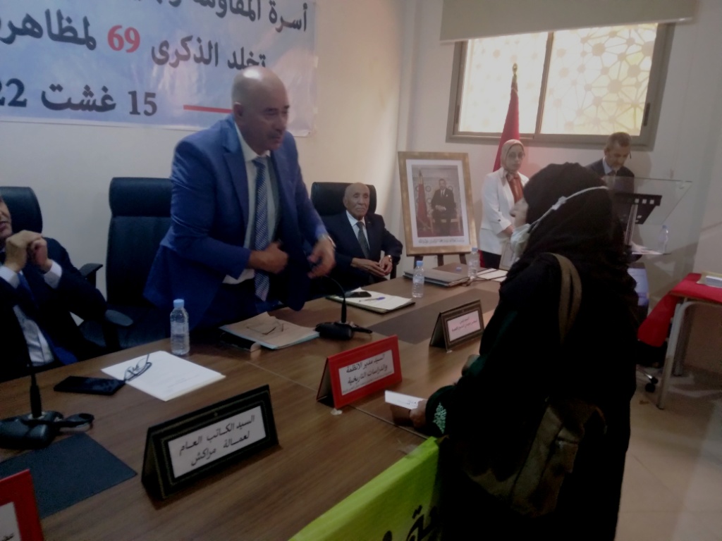خلدت أسرة الحركة الوطنية والمقاومة وجيش التحرير ومعها ساكنة تراب عمالة مراكش مساء يوم الاثنين 15 غشت 2022 ، بقاعة الندوات والمحاضرات بمقر فضاء الذاكرة التاريخية للمقاومة والتحرير التابع للنيابة الجهوية للمندوبية السامية لقدماء المقاومين و اعضاء جيش التحرير بمراكش،الذكرى 69 لمظاهرة المشور الخالدة، كصفحة مشرقة ومنعطفا حاسما في ملحمة التحرير الخالدة بقيادة العرش العلوي المجيد والشعب المغربي الأبي وفاتحة ملحمية لفترة الكفاح الوطني من أجل الشرعية والذود عن الوطن وتوابثه، والنضال من أجل التحرير والانعتاق من ربقة المستعمر الغاشم.