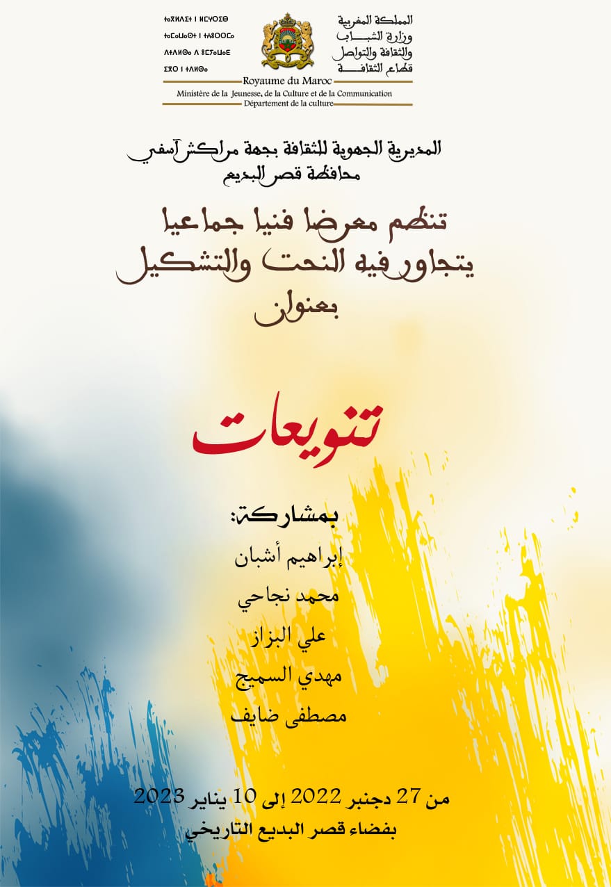 تحت عنوان “تنويعات”،وبمشاركة فنّانين تشكيليين من المغرب والعراق،علي البزّاز، ابراهيم اشبان،محمد نجاحي،مصطفى ضايف، ومهدي السميج، تنظم المديرية الجهويّة للثقافة بجهة مراكش أسفي ومحافظة قصر البديع، معرضا جماعيّا، حيث سيتم إفتتاحه يوم الثلاثاء 27 دجنبر الحالي،على الساعة السادسة مساء،ً ليستمر إلى غاية 10 يناير المقبل .