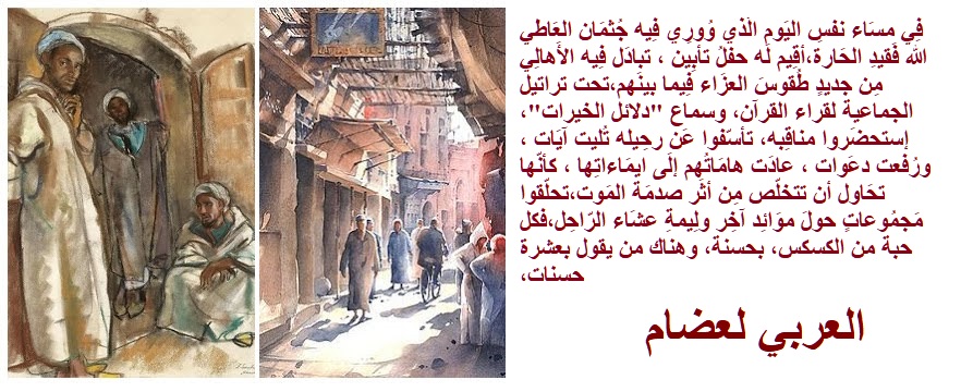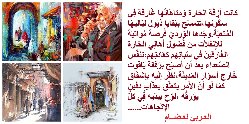 رجَع شيُوخ الحارَة إِلى مآويهِم، أكواخٌ مُتناثرَة هنا وهنَاك على مدَار شريطِ سطُوح مدينتِهم المسورة ، يعانُون من أثَر ألَم رحلَة سفرٍ سرمَديّ، أجسادُهم تحمِل هامَاتٍ مدجّجة بعَماماتٍ ملوّنةٍ،نظراتُهم تائِهة بينَ الأرضِ والسّماء ، افقدها الموت المتربّص بهَا الإحساس بِبوصلَة الزّمن المُهاجر ِإلَى مَدارَاتِه اللاّمُتناهِية بعدَما شيّعُوا جُثمَان جلِيسِهم وراوِيتهِم الرّاحل العَاطي الله إِلى مُستقرّه الأَخيرِ بمقبَرة المَدينَة العَتيقَة قُرب أَحد أَسوارِها المُتآكل .
