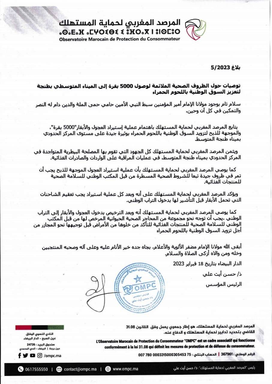 وحسب بلاغ صحافي من ذات المركز، فإن هذا الأخير، يثمن المرصد المغربي لحماية المستهلك كوصول 5000 بقرة إلى الميناء المتوسطي بطنجةل الجهود التي تقوم بها المصلحة البيطرية المتواجدة في المركز الحدودي بميناء طنجة المتوسط، في عمليات المراقبة على الواردات والصادرات الغذائية.