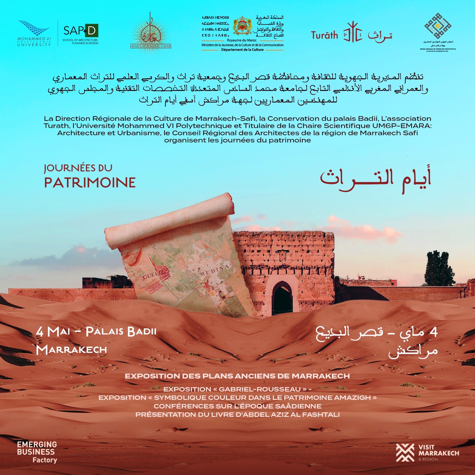 بمناسبة شهر التراث، تنظم المديرية الجهوية للثقافة بمراكش آسفي ،محافظة قصر البديع بشراكة مع كل من جمعية تراث، وجامعة محمد السادس المتعددة التقنيات ، الحاصلة على كرسي UM6P-EMARA العلمي، حول العمارة والعمران والمجلس الجهوي للمهندسين بجهة مراكش آسفي يوم الخميس المقبل 4 مايو ، بقصر البديع بمراكش، فعاليات شهر التراث المذكور .