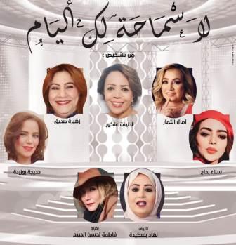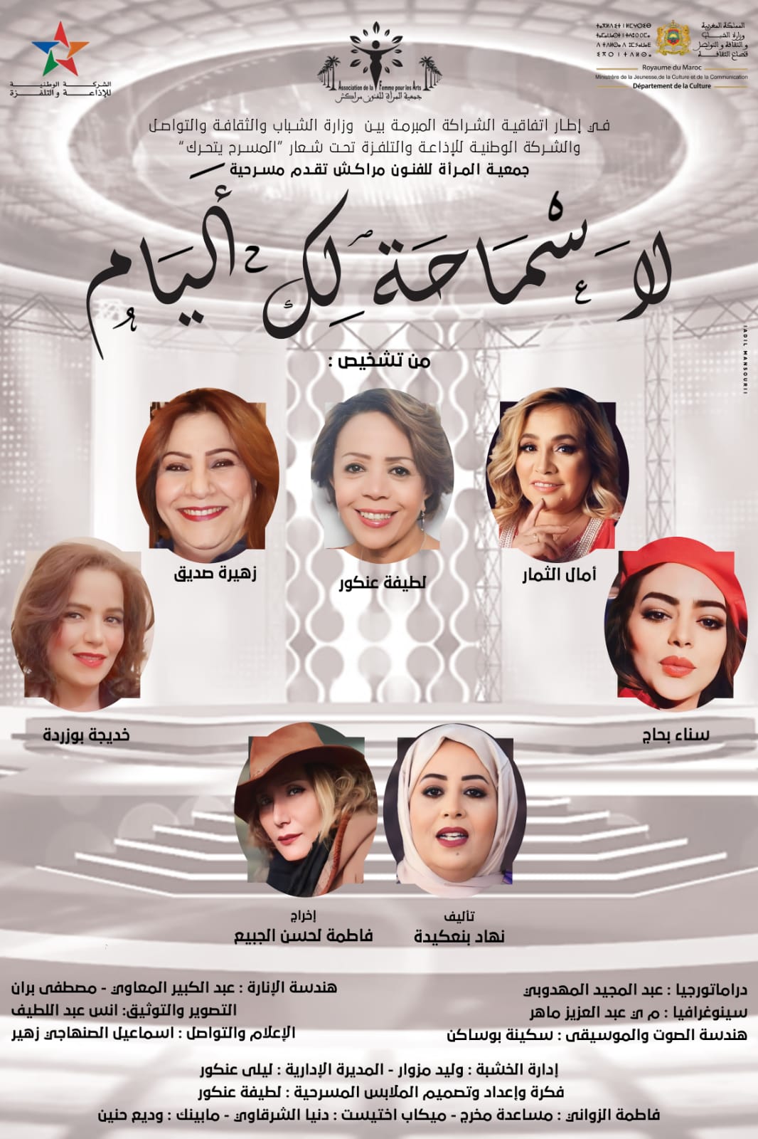 في إطار الشراكة المبرمة بين قطاع الثقافة، لوزارة الشباب والثقافة والتواصل، والشركة الوطنية للإذاعة والتلفزة، وتحت شعار ” المسرح يتحركــ” قدمت جمعية المرأة للفنون مراكش مسرحية “لا سماحة لك أ ليام”، للكاتبة المسرحية، والإعلامية، نهاد بنعكيدة،و اخراج فاطمة الجبيع، والتي قام بتشخيص أدوارها كل من الفنانات لطيفة عنكور، زهيرة صديق، أمال الثمار ،خديجة بوزرد ة وسناء بحاج. في حين قام بالسينوغرافيا مولاي عبد العزيز ماهر، و دراماتورجيا عبد المجيد المهدوبي، بمعية ثلة من التقنيين في مجالات الصوت والملابس والمحافظة العامة والتواصل. يتميز عرض مسرحية “لا سماحة لك أ ليام”، بنصه القوي الذي نجح بشكل لافت في المزاوجة بين الثرات المغربي العريق والدارجة المغربية العامة المشتركة بين أبناء وبنات الدول المغاربية، مما ساعده في أن يكون نصا مسبوكا على مستوى استعمال ألفاظ اللغة، ودلالاتها المتعددة الإيحاءات والمعاني، حيث أبرز النص المسرحي المذكور ثراءه من خلال لحظات الحكي والبوح والمكاشفة بين “الفنانات” الباحثات عن دائرة ضوء من أجل التألق و الإنعتاق، ضمن أسرة يجمعها هم واحد وطموح واحد وسقف واحد.