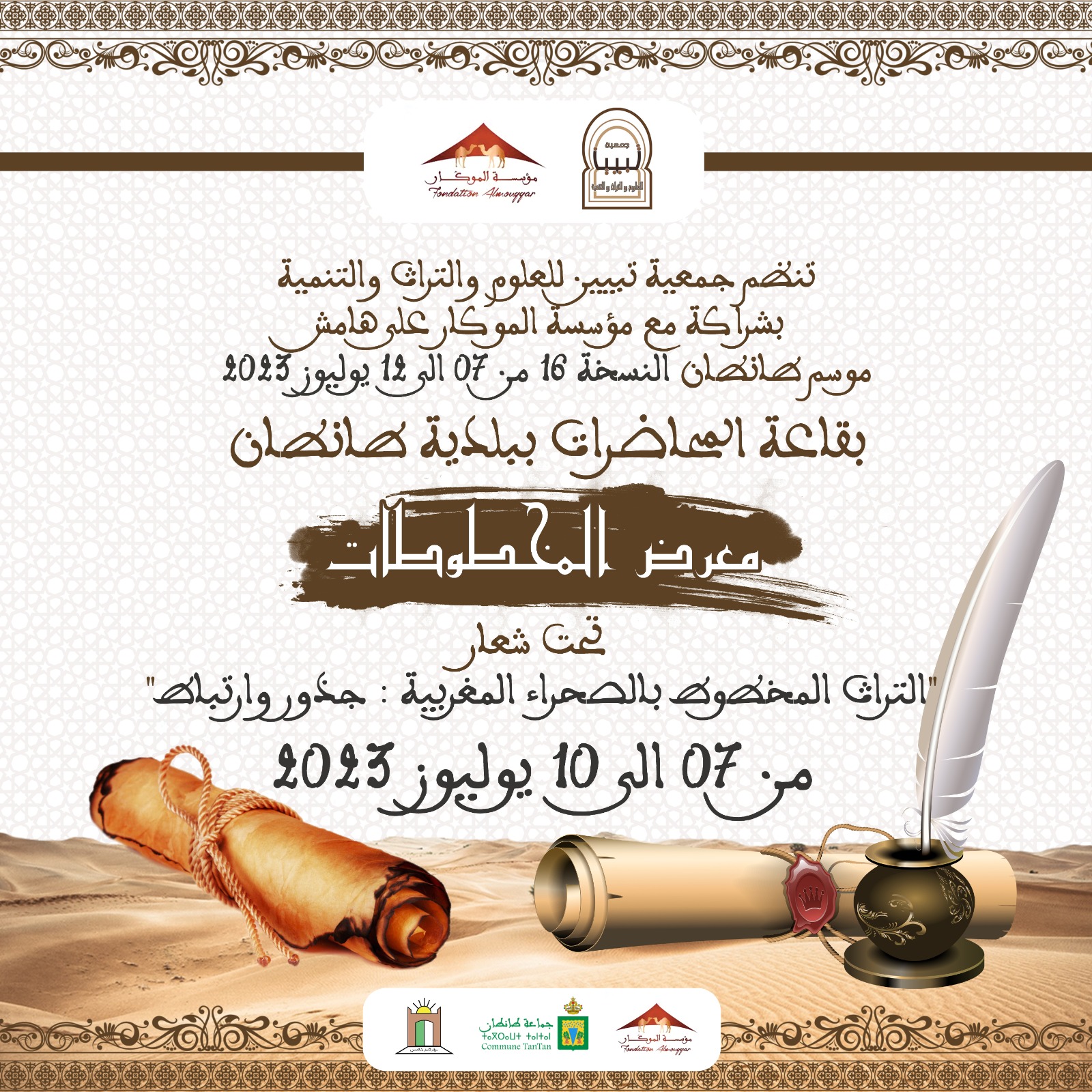 تنظم جمعية تبيين للعلوم والتراث والتنمية، معرضا تعريفيا بتراث المنطقة العلمي والتاريخي. وذلك من خلال رواق كبير لمخطوطات تعرضه و لاول مرة بطنطان مكتبات عائلية من اكادير، تزنيت والعيون ومدن أخرى. علاوة على نسخ ووثائق تاريخية وعلمية شتى، حرصت الجمعية على جمعها وفق مواضيع تلامس أهداف تظاهرة أمكار طانطان، من بينها طانطان في الوجدان الشعري، التمازج الأدبي بين الصحراء وسوس، النوازل الفقهية والإجازات العلمية، نظرة أهل الصحراء للاختراعات، وتدويناتهم لانطباعاتهم الأولية حين عرفوها…. هذا المعرض تواكبه ندوات حول الشعر الحساني والطباعة الحجرية، وكذلك دور المخطوط في الدفاع عن حجية المغرب في صحرائه. طيلة أيام هذه التظاهرة التي تنظمها الجمعية بشراكة مع مؤسسة المكار، أيام من 7 إلى 10 يوليوز الحالي وذلك تحت شعار” التراث المخطوط بالصحراء المغربية: جذور وارتباط”، بقاعة المحاضرات في بلدية طانطان.
