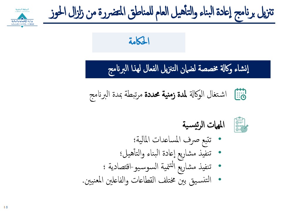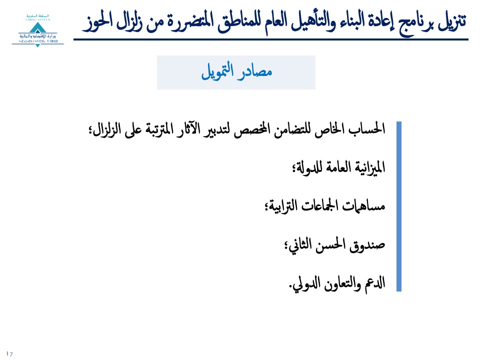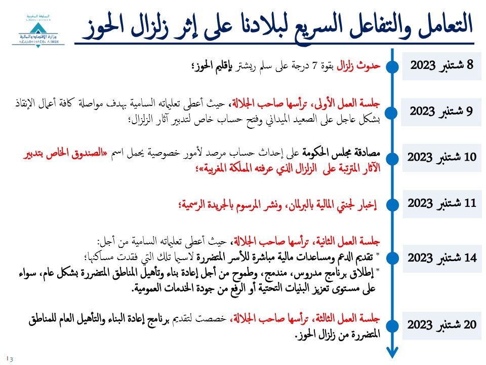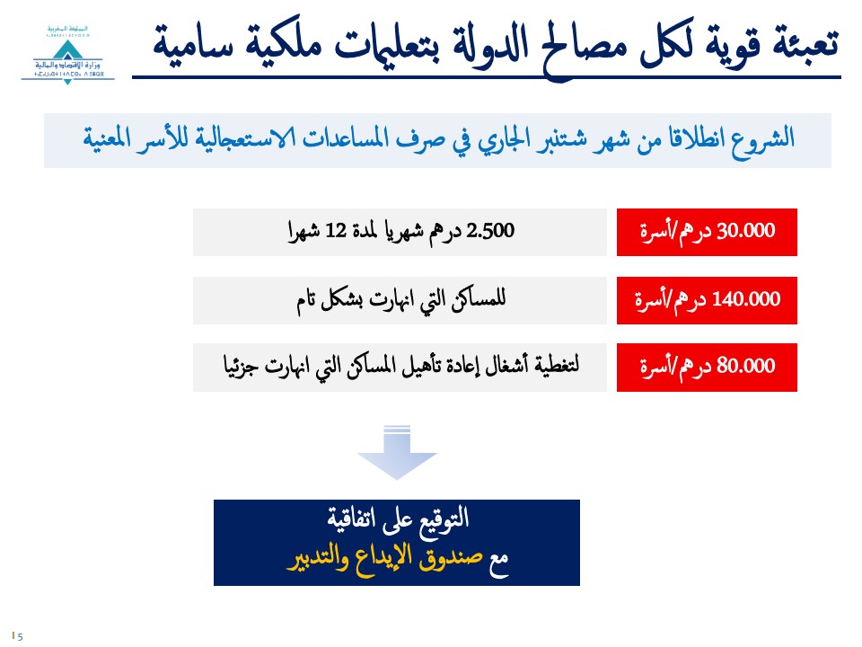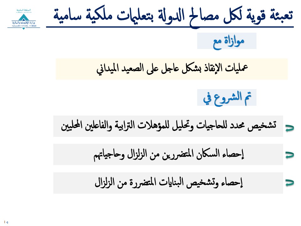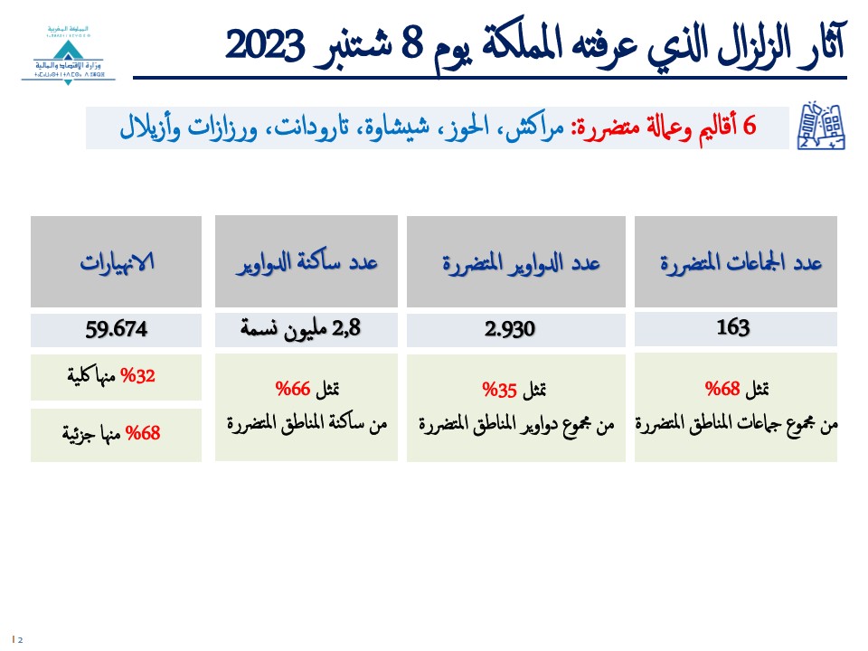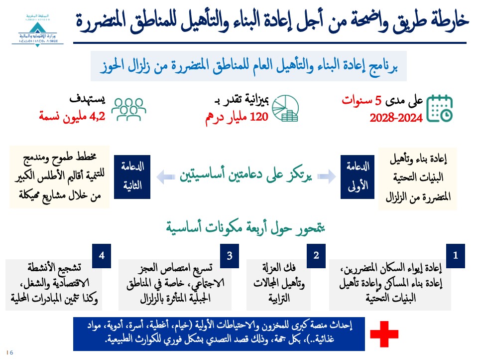 وأشادت رئاسة الأغلبية الحكومية، في بلاغ صدر عقب هذا الاجتماع، عاليا بحكمة وتبصر صاحب الجلالة الملك محمد السادس، في التدبير الناجع والفوري لآثار الزلزال الذي تعرضت له المملكة، ورؤية جلالته متعددة الأبعاد المتعلقة بإطلاق برنامج ضخم لمعالجة مخلفات الزلزال، عبر إنصاف ومساندة الأسر المتضررة، وإعادة بناء المساكن وتأهيل البنيات التحتية المتضررة، وفك العزلة وتأهيل المجالات الترابية، وتعزيز التنمية الاجتماعية والاقتصادية في المناطق المستهدفة.