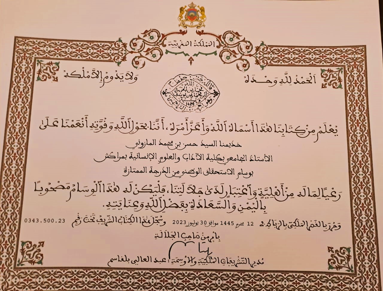 واليوم، وأنا إذ أكتبُ ما أكتبُ عن صديقي الدكتور حسن المازوني، وعن شيء من مساراته المتعددة، وعطاءاته المتميزة، فإني أعرف أن توشيحه بالوسام الملكي، وسام الإستحقاق الوطني من الدرجة الممتازة، والمُنعم عليه به من طرف جلالة الملك محمد السادس نصره الله، والمقدم له من طرف الدكتور بلعيد بوكادير، رئيس جامعة القاضي عياض، هو توشيح للأوساط الأكاديمية، وللمجتمع الثقافي في مراكش، الذي يتألف من معلمين ومهندسين ومؤلفين وأطباء وأدباء وإعلاميين وحقوقيين وباحثين ومبتكرين وتشكيليين وموسيقيين وشعراء …
