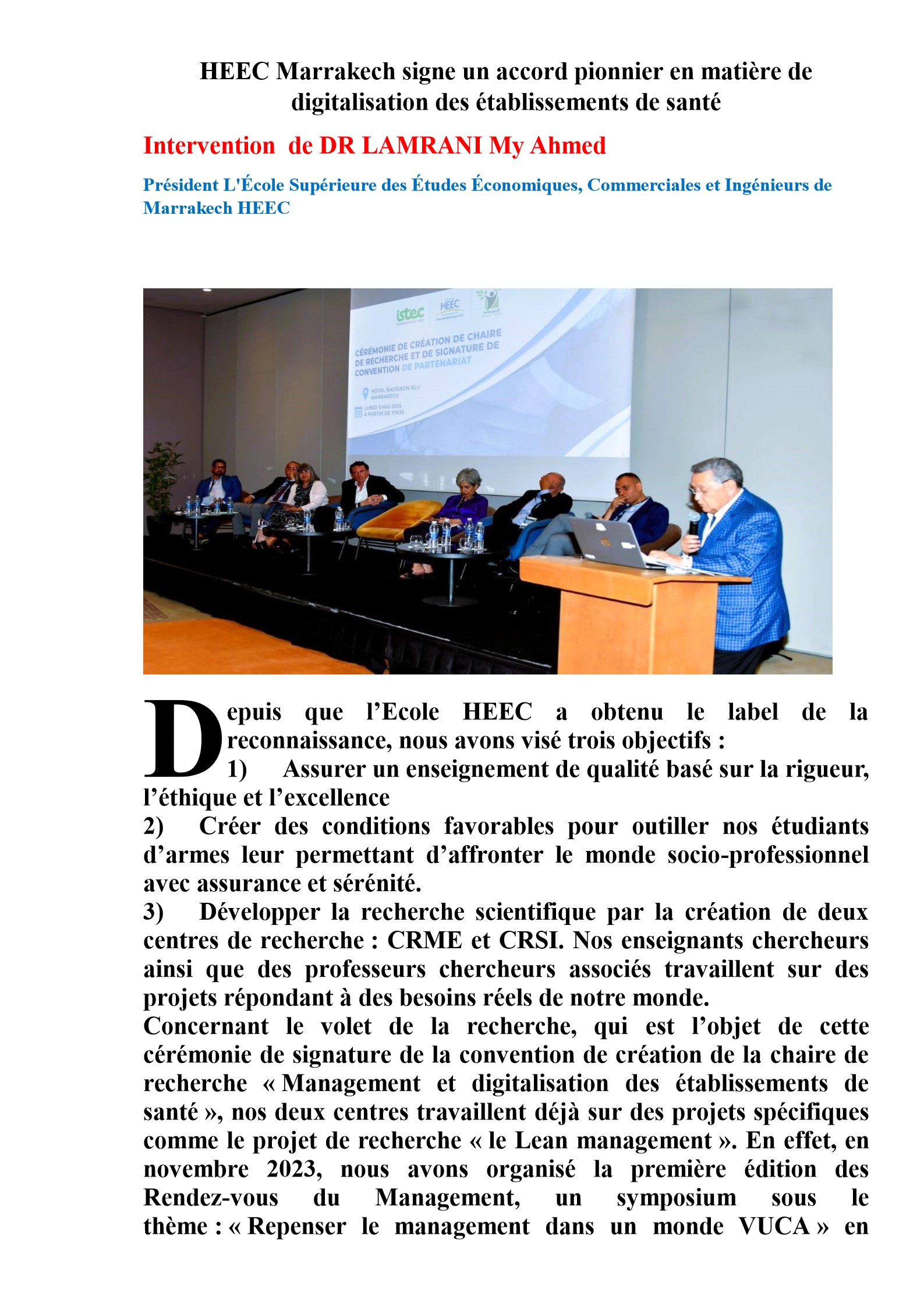 كلمة الدكتور مولاي أحمد العمراني خلال حفل توقيع الشراكة لإفتتاح كرسي للبحث؛ حول إدارة ورقمنة المؤسسات الصحية، بالمدرسة العليا للدراسات الإقتصادية والتجارية والهندسية بمراكش HEEC :