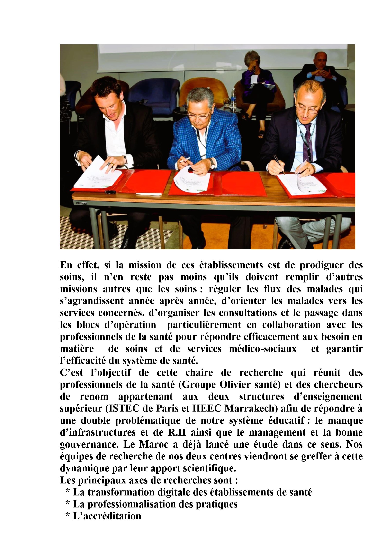 منذ أن حصلت مدرسة HEEC على علامة التقدير، قمنا بتحقيق ثلاثة أهداف: 1) ضمان جودة التدريس على أساس الدقة والأخلاق والتميز 2) تهيئة الظروف المواتية لتزويد طلابنا بالأسلحة التي تتيح لهم مواجهة العالم الاجتماعي والمهني بثقة وهدوء. 3) تطوير البحث العلمي من خلال إنشاء مركزين بحثيين: CRME و CRSI. حيث يعمل الأساتذة لدينا بالإضافة إلى الأساتذة الباحثين المرتبطين بهم على مشاريع تلبي الاحتياجات الحقيقية لعالمنا. وفيما يتعلق بالجانب البحثي، وهو موضوع حفل التوقيع على اتفاقية إنشاء كرسي الأبحاث “إدارة ورقمنة المؤسسات الصحية”، فإن مركزينا يعملان بالفعل على مشاريع محددة مثل بحث “الإدارة الهزيلة”. وبالفعل، نظمنا في نوفمبر 2023 النسخة الأولى من ملتقى الإدارة، وهي ندوة تحت شعار: “إعادة التفكير في الإدارة في عالم VUCA” بشراكة مع “جامعة الحسن الأول” ممثلة بـ FEG سطات و Olivier Santé Group في شخص الدكتور رشيق لا أستطيع أبدًا أن أشكره بما فيه الكفاية على مشاركته في مجال البحث المتعلق بقطاع نشاطه. إن نجاح هذا الحدث العلمي الذي جمع باحثين بارزين من مختلف الجامعات الوطنية والدولية أعطانا المزيد من القوة للمضي قدمًا في ديناميكيتنا. كان لدى فرقنا البحثية فكرة إعادة صياغة وإعادة النظر في رؤيتنا للبحث العلمي من خلال إعادة توجيهها نحو موضوعات أكثر تحديدًا وحداثة. وهذه الاستراتيجية الجديدة يمليها التطور السريع للبيئة التكنولوجية وبالتالي الاقتصادية والقانونية والثقافية التي تتطلب بحثا علميا ذا طبيعة مختلفة. ولذلك فإننا نواجه تحديًا علميًا يمكنه تقديم حلول فعالة لمشاكل الإدارة الجديدة لعالمنا الرقمي. ولتلبية هذه الحاجة، وبناء على اقتراح الأستاذ الصرافي نبيل، الذي نشكره على الجهود التي بذلها لإنجاح هذا الاجتماع، كان من الضروري الجمع بين جهات فاعلة من خلفيات مختلفة لها نفس الاهتمام: مؤسستان للتعليم العالي منخرطتان في البحث العلمي (HEEC Marrakech وISTEC في باريس) ومجموعة Olivier Santé التي نحييها (مرة أخرى) لمشاركتها في مجال البحث. لقد اختارت المكونات الثلاثة الأداة الأنسب لتحقيق هدفنا: ومن هنا جاءت فكرة إنشاء “كرسي بحث علمي بعنوان: إدارة ورقمنة المؤسسات الصحية”. إن اختيار الموضوع وعنوان الكرسي ليس بالأمر الهين. في الواقع، المغرب في خضم إصلاح قطاع الصحة. خلال الأزمات التي مررنا بها، أدركنا أن المستشفيات كانت تكافح من أجل تلبية احتياجات المستخدمين في مهام الرعاية الخاصة بهم. ظلت إدارة مؤسساتنا الاستشفائية تقليدية ولم تتطور مع الاتجاهات الصحية الجديدة بسبب التغيرات الديموغرافية المرتبطة بزيادة متوسط العمر المتوقع. لم يتمكن مديرو مستشفياتنا من تهيئة الظروف لتلبية احتياجات المرضى. في الواقع، إذا كانت مهمة هذه المؤسسات هي توفير الرعاية، تظل الحقيقة أنه يجب عليها أداء مهام أخرى غير الرعاية: تنظيم تدفق المرضى الذي يتزايد عامًا بعد عام، و”توجيه المرضى نحو الخدمات المعنية، وتنظيم الاستشارات والمرور عبر المستشفيات”. غرف العمليات خاصة بالتعاون مع المهنيين الصحيين للاستجابة بفعالية للاحتياجات فيما يتعلق بالرعاية والخدمات الطبية والاجتماعية وضمان كفاءة النظام الصحي. هذا هو الهدف من كرسي البحث هذا الذي يجمع المهنيين الصحيين بمجموعة “أوليفييه سانتي” والباحثين المشهورين المنتمين إلى هيكلي التعليم العالي في ISTEC de Paris وHEEC Marrakech وذلكــ من أجل الاستجابة لمشكلة مزدوجة لنظامنا التعليمي: الافتقار إلى البنية التحتية والموارد البشرية وكذلك الإدارة والحكم الرشيد. وقد أطلق المغرب بالفعل دراسة في هذا الاتجاه. وستضيف فرقنا البحثية من مركزينا إلى هذه الديناميكية من خلال مساهمتهم العلمية. كما أن المجالات الرئيسية للبحث ترتكز على : * التحول الرقمي لمؤسسات الرعاية الصحية. * احتراف الممارسات. *الاعتماد الاكاديمي. * تعزيز مهارات المديرين المحليين. * الثقافة الموجهة للمريض. * دمج الذكاء الاصطناعي في مجالات الصحة.