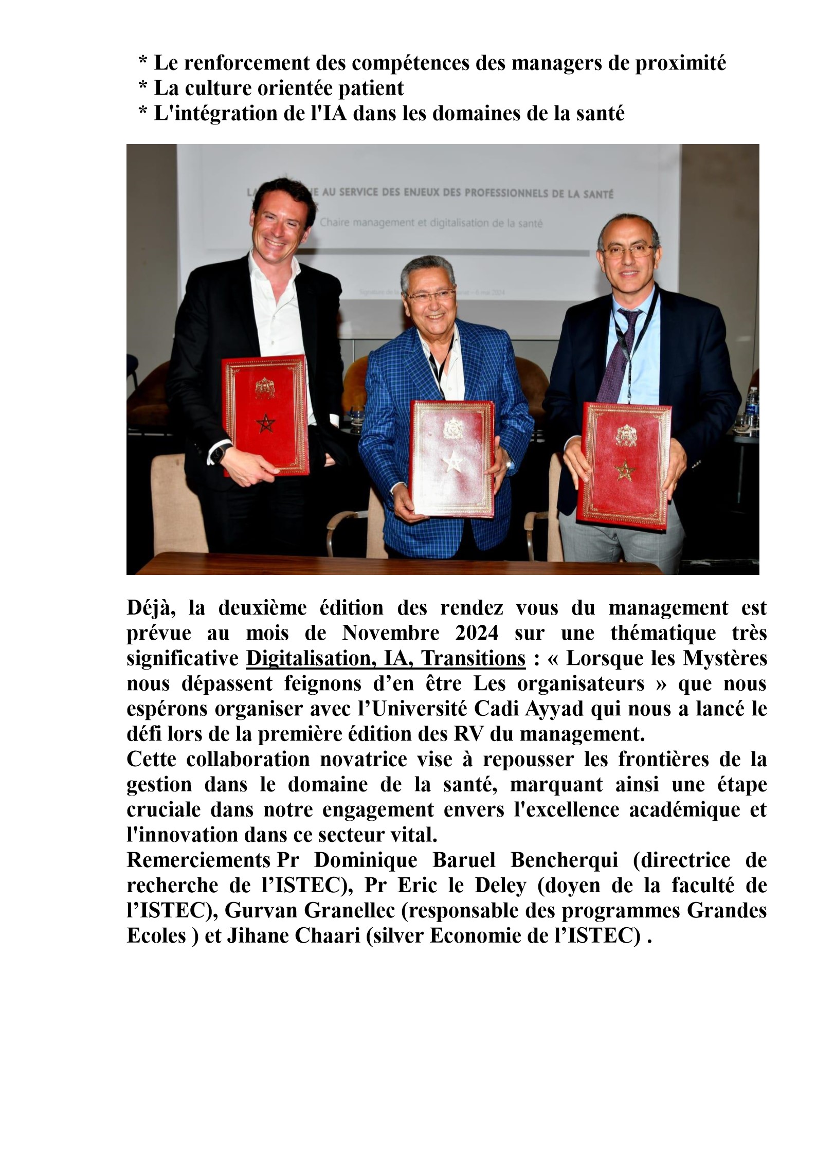 وبالفعل، فمن المقرر عقد النسخة الثانية من اجتماعات إدارة المدرسة العليا للدراسات الإقتصادية والتجارية والهندسية بمراكش HEEC في نوفمبر 2024 حول موضوع مهم للغاية وهو الرقمنة،والذكاء الاصطناعي، والتحولات، فعندما تتجاوزنا الألغاز، دعونا نتظاهر بأننا منظميها” والتي نأمل في تنظيمها مع جامعة القاضي عياض التي تحدتنا عنها خلال الطبعة الأولى من Management VR. ويهدف هذا التعاون المبتكر إلى دفع حدود إدارة الرعاية الصحية، مما يمثل خطوة حاسمة في التزامنا بالتميز الأكاديمي والابتكار في هذا القطاع الحيوي. وقبل أن أختتم كلمتي، فإني أتقدم بالشكر والتقدير للبروفيسور دومينيك بارويل بن شرقي مديرة الأبحاث في المدرسة العليا للتجارة والتسويق بباريس ISTEC، والبروفيسور إريك لو ديلي عميد المدرسة العليا المذكورة ISTEC، والبروفيسور جورفان جرانيليك رئيس برامج المدارس الكبرى،ولكل من جيهان الشرعي عن silver Economie de l’ISTEC .