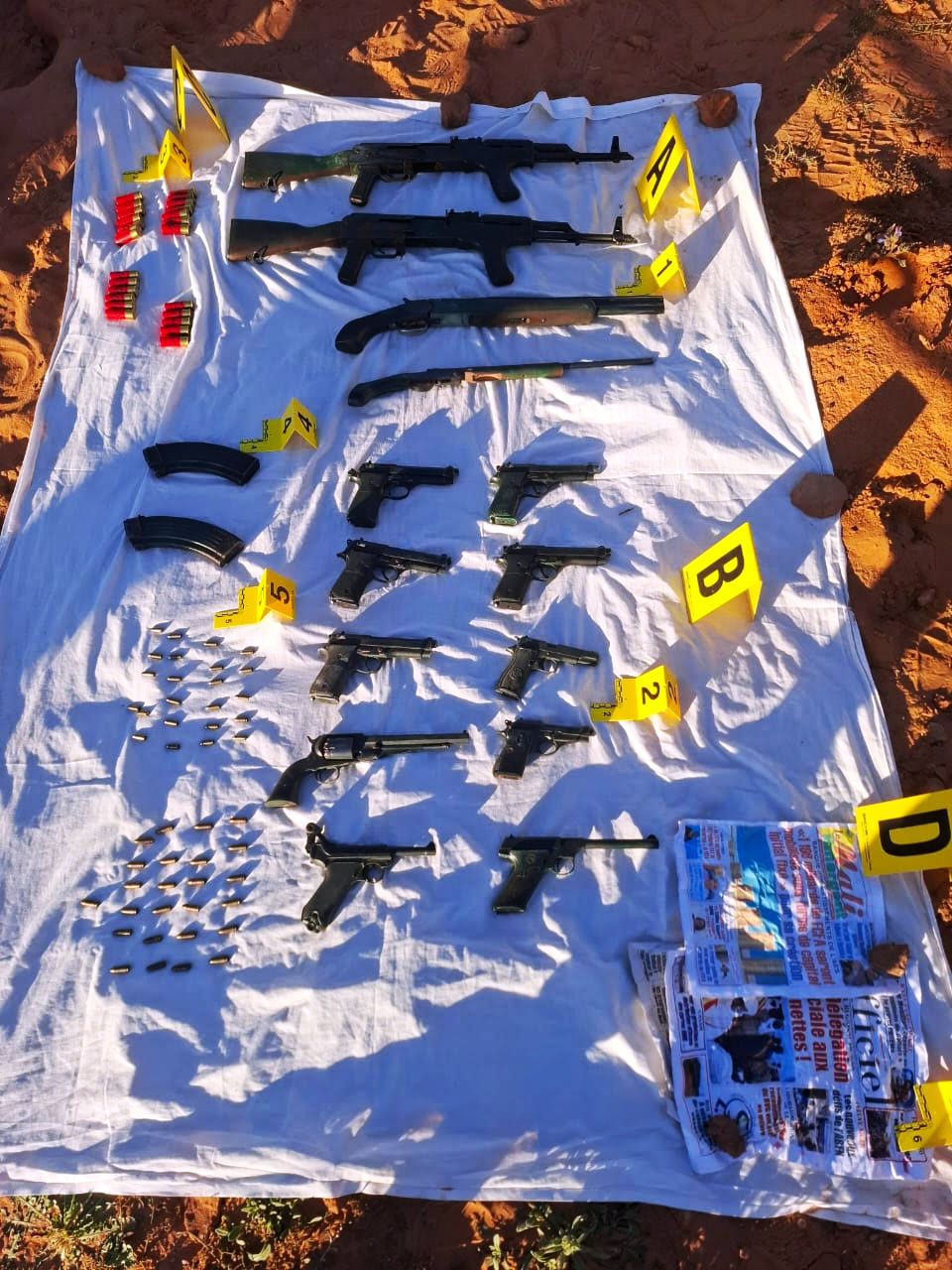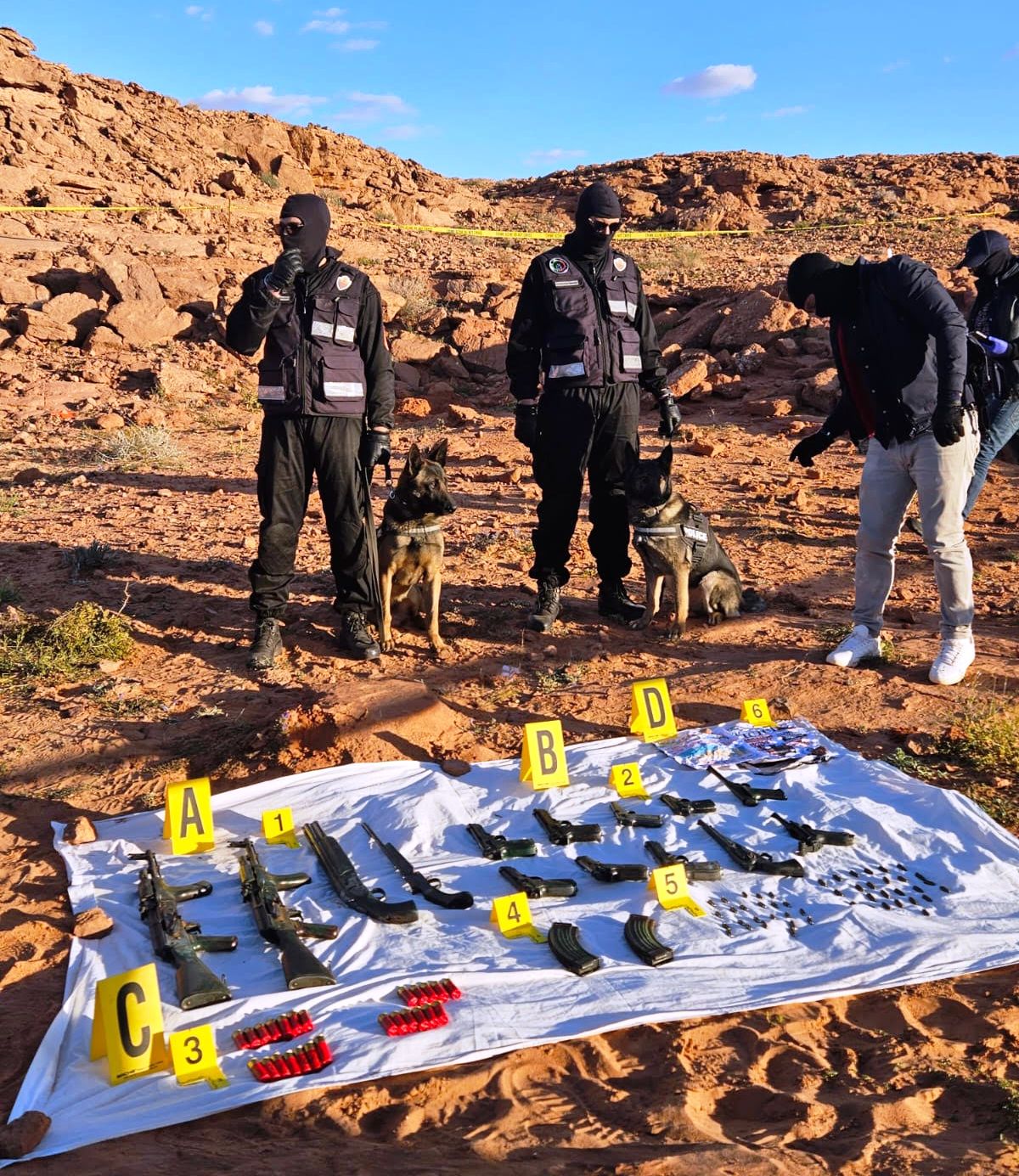 وتتمثل الأسلحة النارية المحجوزة في إطار هذه العملية ، في سلاحي كلاشينكوف مع خزانين للذخيرة، وبندقيتين ناريتين، وعشر مسدسات نارية فردية من مختلف الأنواع، وكمية كبيرة من الخراطيش والطلقات النارية من عيارات مختلفة، قبل أن يتم وضع مختلف الأسلحة والذخيرة المحجوزة في أختام للحجز، وجردها بشكل مفصل، من أجل إحالتها على المختبر الوطني للشرطة العلمية بغرض إخضاعها للخبرات الباليستيكية والتقنية اللازمة.