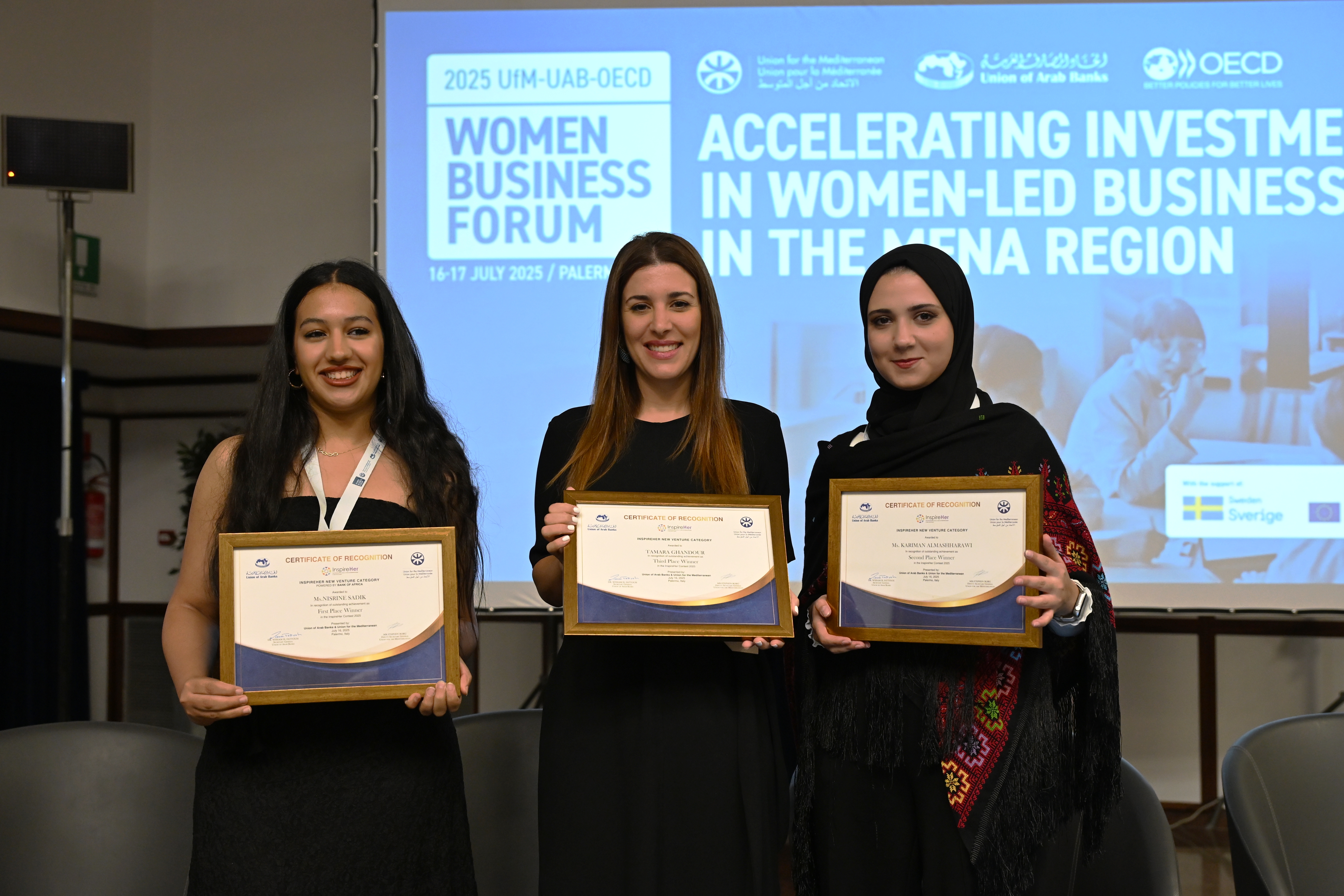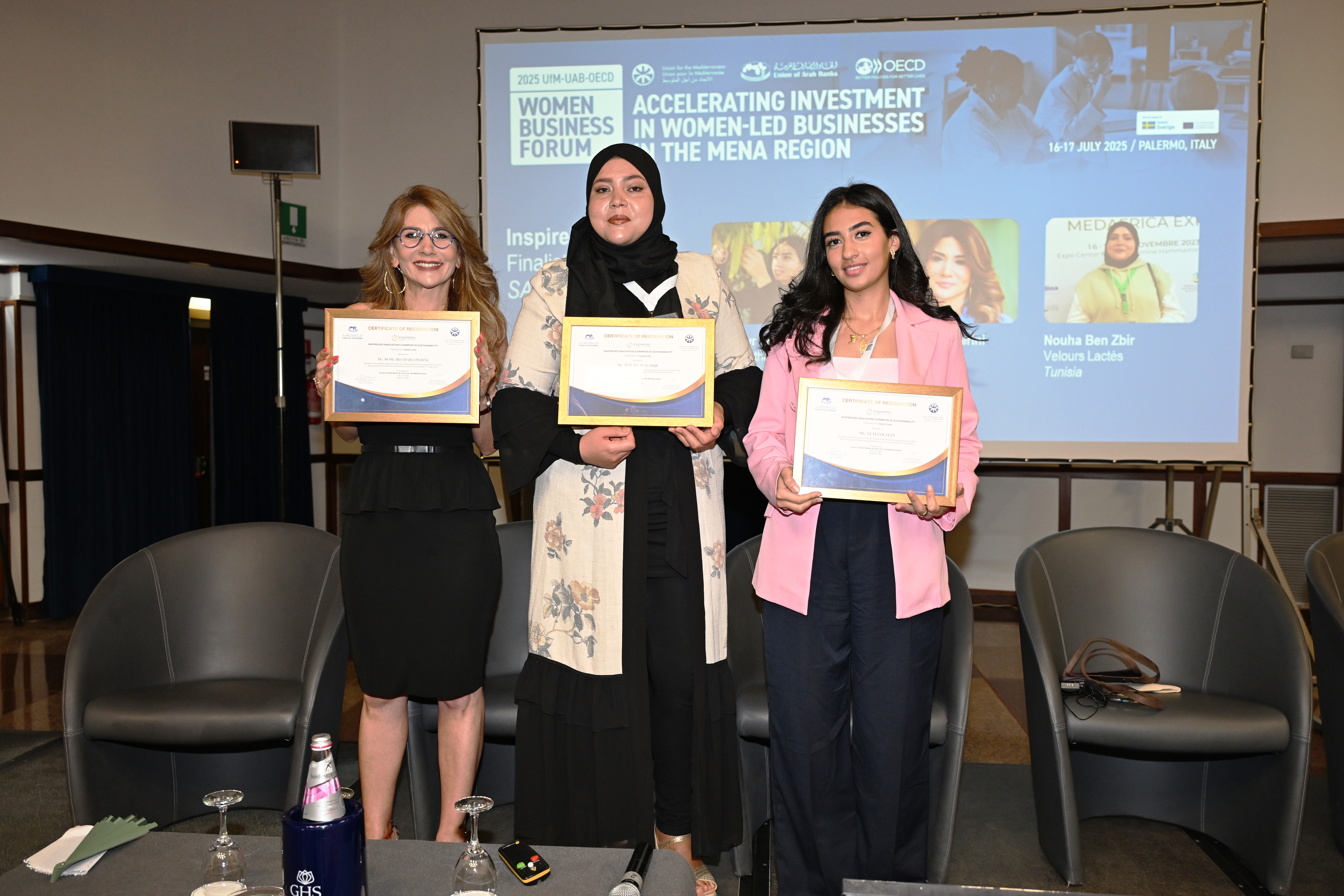 كما تم اختيار عشر رائدات أعمال من مصر والأردن ولبنان وفلسطين وتونس والمغرب للمشاركة في التصفيات النهائية لمسابقة “إلهامُها” لعام 2025، وهي مبادرة للاتحاد من أجل المتوسط واتحاد المصارف العربية تحتفي بالتقدم المحرز في الشمول المالي وريادة الأعمال في منطقة الشرق الأوسط وشمال إفريقيا. ومن بين هؤلاء، تم تكريم أربع فائزات في كل فئة لتميزهن في الابتكار والتأثير.، حيث يتعلق الأمر بكل من :