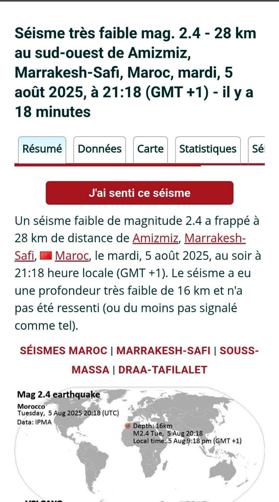 سُجلت اليوم الثلاثاء 5 غشت الجاري، على الساعة التاسعة ليلا و18 دقيقة بتوقيت غرينيتش، هزة أرضية خفيفة على مستوى دائرة أمزميز بإقليم الحوز ، بدرجة 2،4 على سلم ريشتر ، بعمق ضعيف 16 كيلومتر، حيث شعر بها عدد من المواطنين بشكل واضح، ممن باتوا يطالبون بتعزيز التدابير الوقائية، وتوفير الدعم النفسي والاجتماعي.