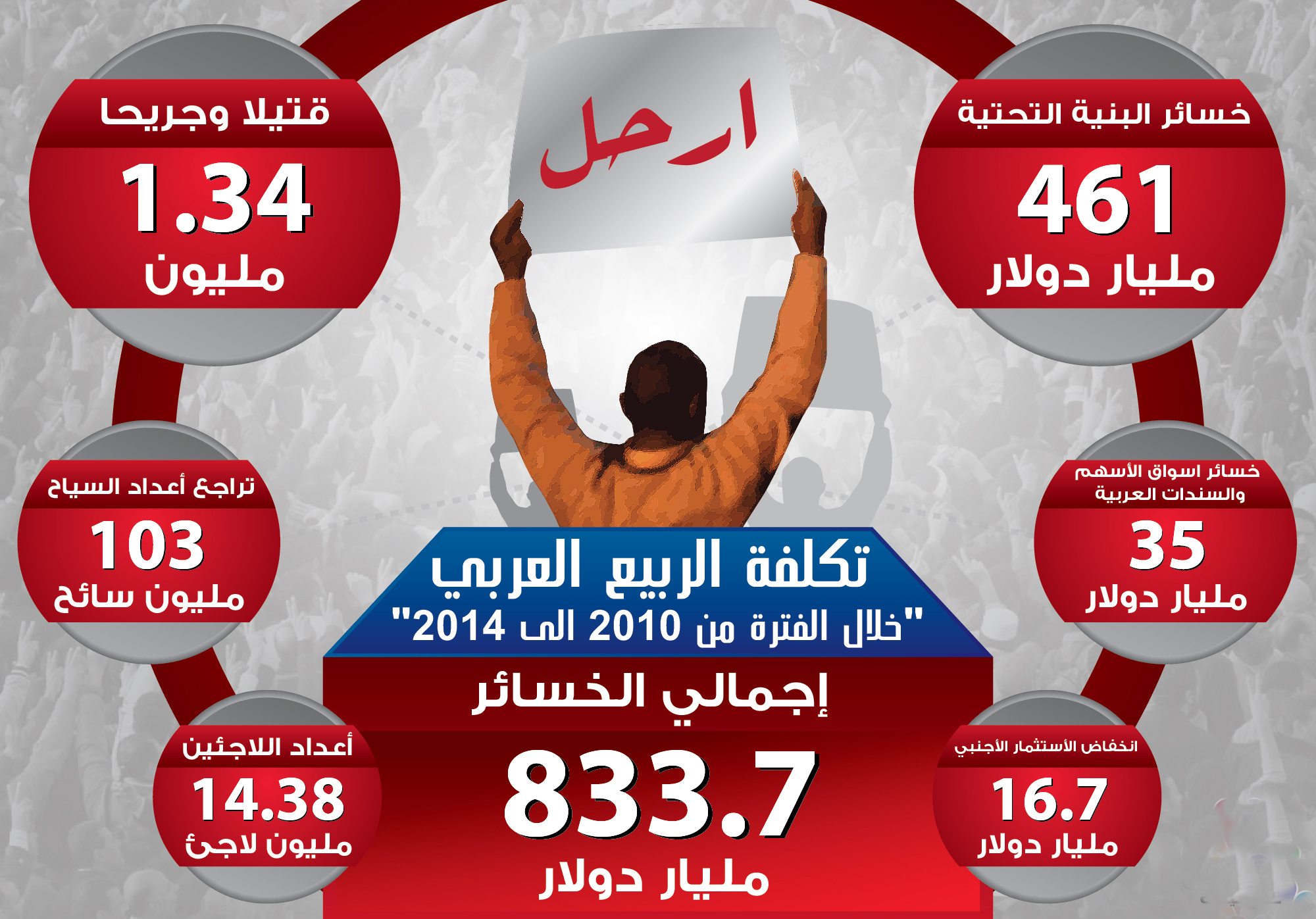 أصدر المنتدى الاستراتيجي العربي للدراسات تقريراً موجزاً بالارقام لتكلفة الربيع العربي خلال السنوات الخمس الماضية وجاءت على النحو التالي: