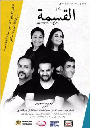 تقدم جمعية إسيل للمسرح والتنشيط الثقافي بشراكة مع مؤسسة Friedrich Ebert الألمانية عملها الفني الجديد،ويتعلق الأمر بمسرحية”القسمة” التي سيشاهدها جمهور مدينة مراكش يوم الإثنين 19يونيو2017 على الساعة العاشرة ليلا بدار الثقافة الداوديات، في مراكش